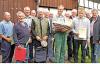 Leopoldshöhe Leopoldshöher Mäh- und Dengelmeisterschaft auf dem Heimathof Jürgen Sonnenberg zum ersten Mal Sieger (gs). Bis 2009 richteten Gisela und Gustav Köster auf ihrem Hof an der Schackenburger Straße die Leopoldshöher Mäh- und Dengelmeisterschaft aus. Nun fand sie das zweite Mal auf dem Heimathof Leopoldshöhe mit Acht Teilnehmern statt. Sieger des Wettbewerbs wurde Jürgen Sonnenberg aus Detmold, der es sich ?mit seiner Familie erst am Abend zuvor überlegt hatte, auch mal ?an so einem Wettbewerb teilzunehmen?. Auf dem zweiten Rang landete Patrick Gelsen (der jüngste Teilnehmer seit drei Jahren. Den dritten Platz teilten sich Karl-Heinz Weitenhöfer und der dreimalige Sieger Friedel Elkenkamp. Zu Beginn des munteren Wettstreits griff Erich Linnemann zum Akkordeon, um traditionell die ?Amboss-Polka? erklingen zu lassen. Die übrigen Teilnehmer begleiteten ihn, indem sie im Takt den Hammer schlugen. Wie sonst auch, musste beim Wettbewerb zunächst die Schnittkante vorbereitet werden. Mit kleinen, vorsichtigen Hammerschlägen ? dem Dengeln ? wird der vordere Teil des Sensenblattes so bearbeitet, dass eine gleichmäßige, schartenfreie Linie entsteht. Die Schiedsrichter Gustav Köster, Helmut Eikermann und Adolf Meier zu Döldissen vergaben hier schon die ersten Punkte. Begleitet von zahlreichen Zuschauern begaben sich die Aktiven danach auf die Wiese hinter dem Heimathof, wo bereits die Parzellen mit dem bis zu einen Meter hohen Gras warteten. Die Bedingungen waren ideal: Die Halme standen wie eine Eins, und auch die befürchteten Maulwurfshügel waren im Gegensatz zum Vorjahr diesmal nicht vorhanden. Nach kurzer Zeit lagen die Grashalme vorschriftsmäßig und korrekt ausgerichtet auf der Seite. Für die Punktrichter stand schnell fest: ?Es war ein hervorragendes Ergebnis, alle Teilnehmer haben ein hohes Niveau gezeigt?, so Gustav Köster, Helmut Eikermann und Adolf Meier zu Döldissen. Es fiel ihnen gar nicht leicht, eine Wertung vorzunehmen. Weil die erreichten Punkte so dicht nebeneinander lagen, wurden schließlich drei dritte Plätze zweifach vergeben. Schirmherr Gerhard Schemmel gratulierte den Beteiligten zu ihrem Erfolg und überreichte ihnen Urkunden und Sachpreise, die Leopoldshöher Firmen gestiftet hatten. Fotos: Günter Schröder (red) Foto 1: Alle Teilnehmer und Verantwortlichen des Wettbewerbs, in der Mitte mit Präsentkorb der Sieger Jürgen Sonnenberg aus Detmold.